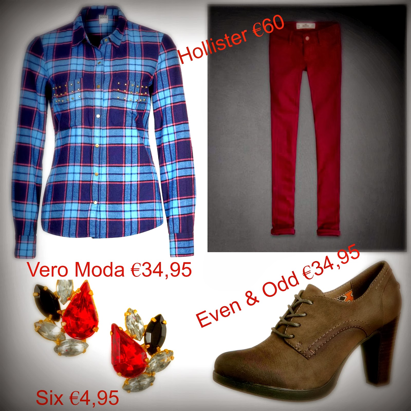 Today, I present to you: the outfit of the week. It's a sportive, casual look which is also fashionable and trendy. Dark red pants are so hot right now! Plaid shirts also are. I think they are very hot, but also very chic. This look is a nice mix of different styles: the sportive shirt, hot pants, cute ankle boots and sturdy ear rings. This fits me perfectly. I like to combine various styles with nice details, like the ear rings.